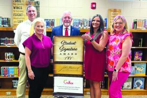 SGES also received the John Hancock award banner. This award celebrates elementary, middle, and high schools that go above and beyond in teaching cursive writing – a skill that builds fine motor strength, enhances literacy, and allows students to engage meaningfully with historical texts in their original form.